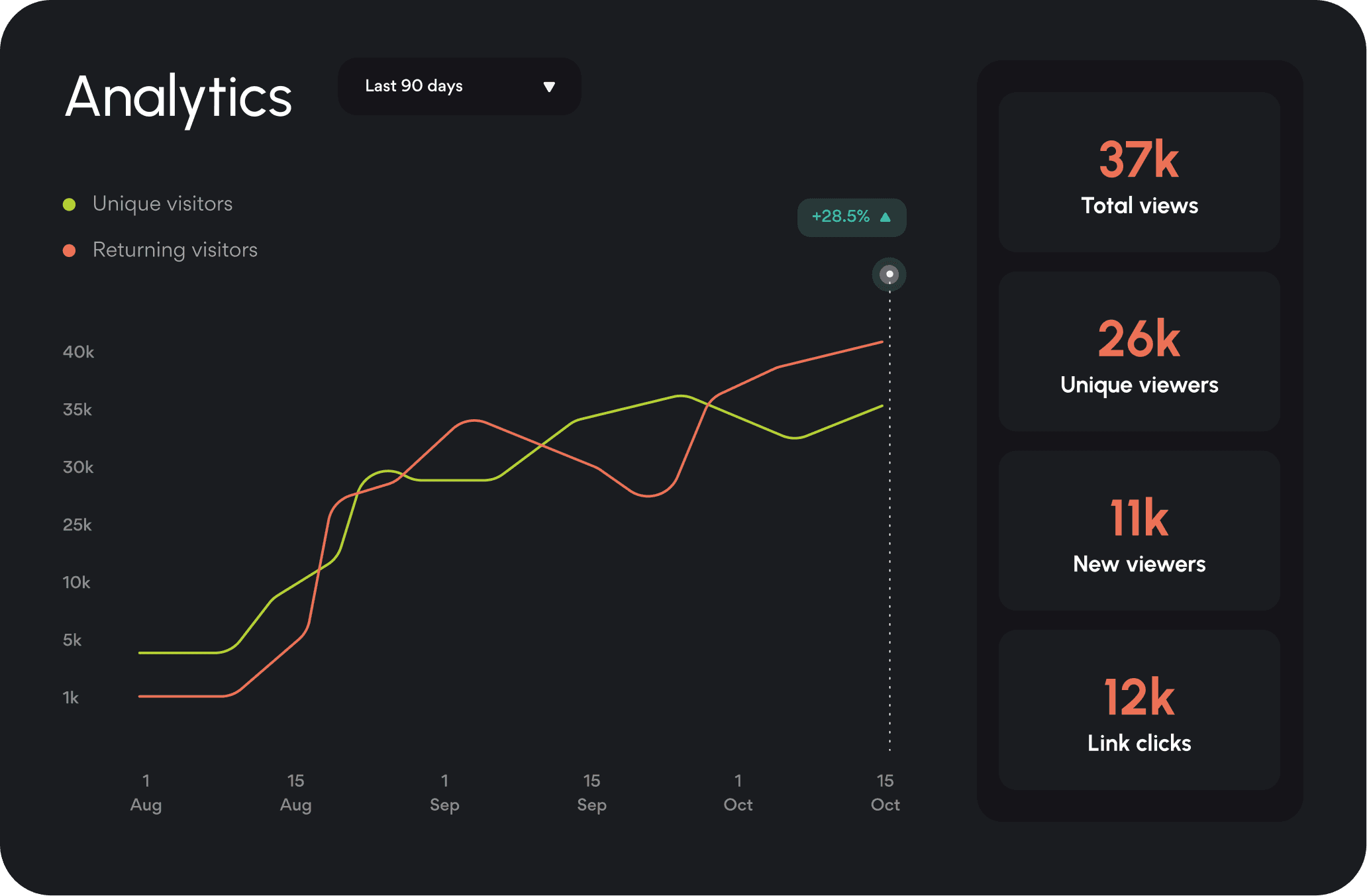 Access free analytics to help you track the growth of your page and audience. Keep tabs on the performance of your links, monthly visitors, and total page views.